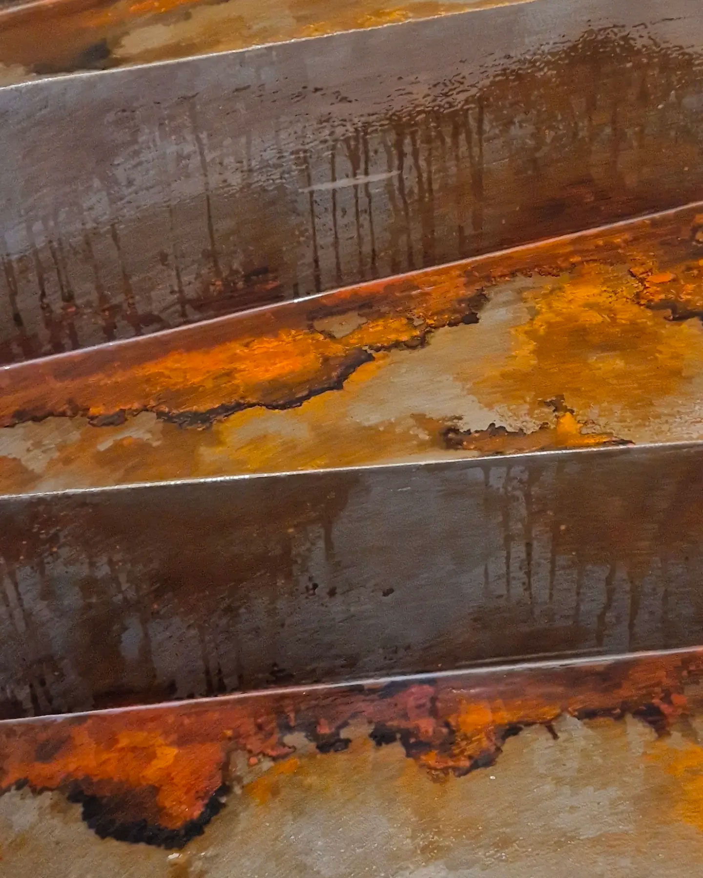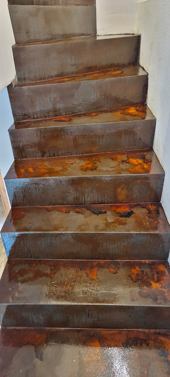 Scala interna di un’abitazione privata realizzata con sistema decorativo effetto corten e resine, finitura lucida.