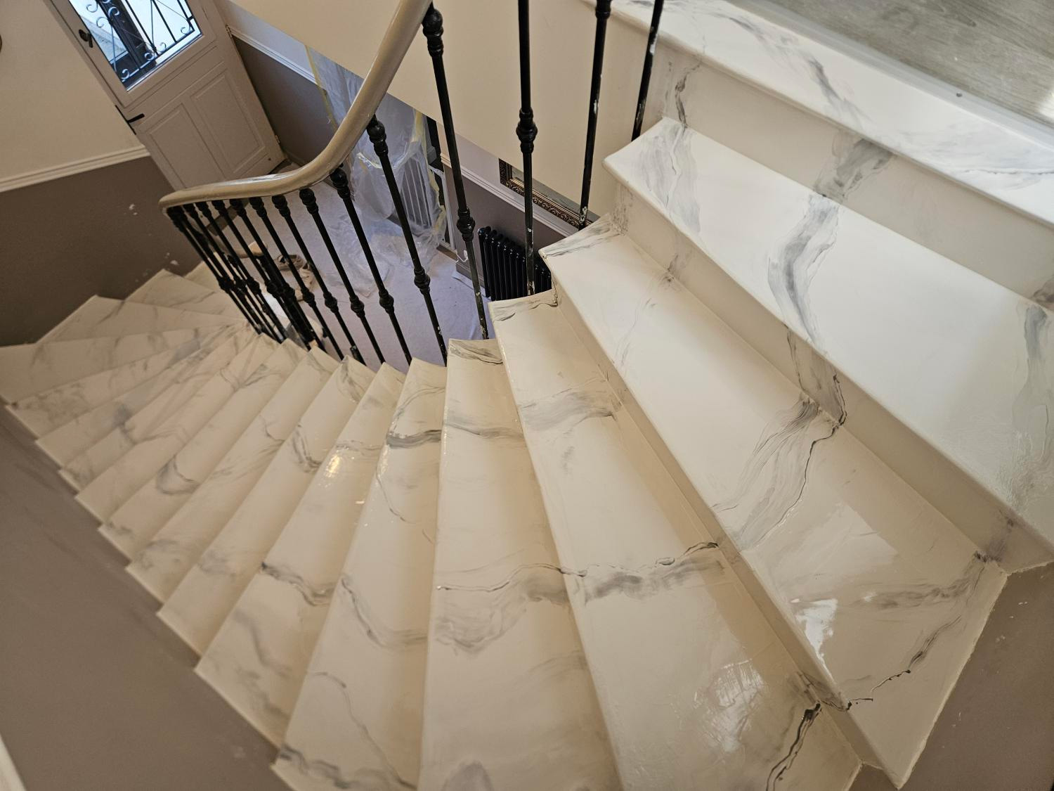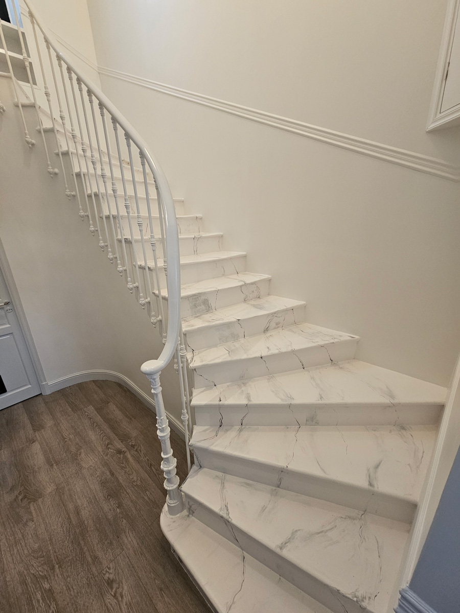 Scala rivestita con resina epossidica decorata, effetto marmo, ral 9010 con venature argento metallizzato e finitura semi lucida.